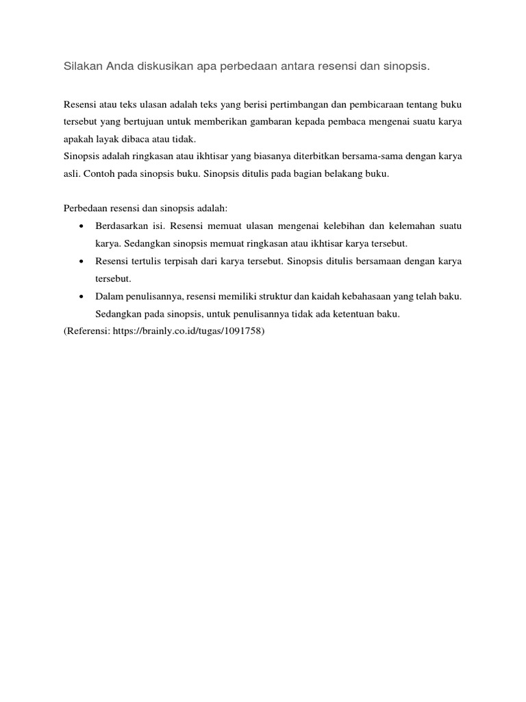 Perhatikan kutipan teks ulasan film berikut! Misalnya berebut makanan, mainan, bahkan berebut ayah dan ibu mereka. Teks ulasan adalah suatu penilaian terhadap sebuah karya, berupa prosa, buku, karya seni film, dan drama. Sinopsis memiliki dua jenis yakni sinopsis tulisan lengkap dan sinopsis sebagai persiapan menulis ide. Sinopsis adalah ringkasan dari suatu karya atau gagasan / gagasan yang ditulis dalam bentuk narasi.